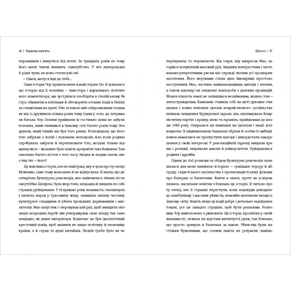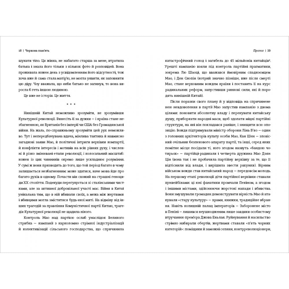 З часів Культурної революції минуло понад 50 років, однак її шрами досі лежать на серці китайського суспільства і душах громадян. Приїхавши в Пекін, кореспондентка Guardian Таня Браніґан усвідомила, що те жорстоке і буремне десятиліття до сьогодні скеровує і формує країну. Однак офіційна цензура й особисті травми породили національну амнезію: пам’ять про Культурну революцію оприявнюється передовсім у білих плямах і за мовчуваннях.