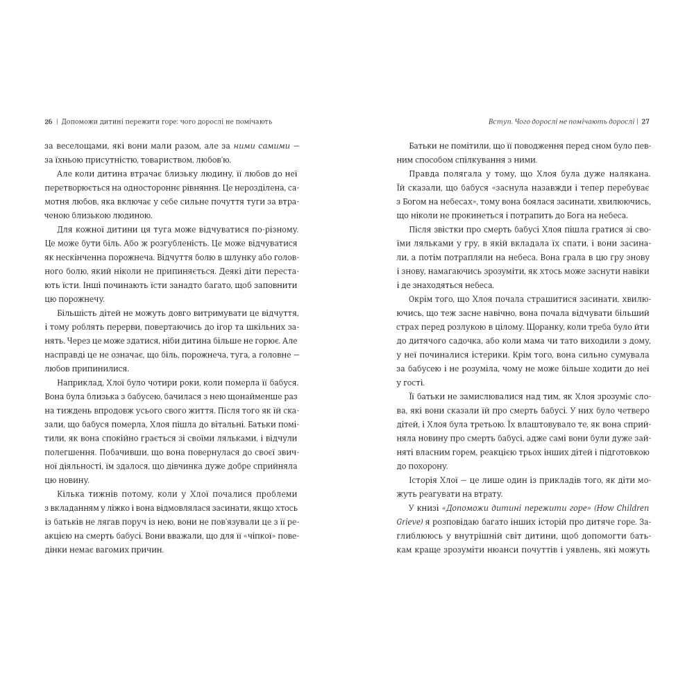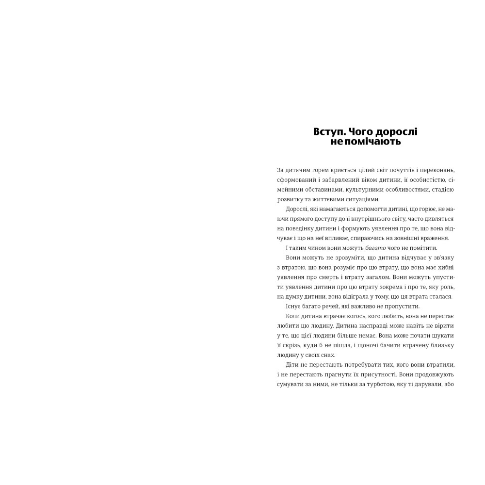 У книжці розглядаються різні типи втрат, з якими можуть зіткнутися діти: смерть близької людини чи домашнього улюбленця, розлучення батьків, переїзд або розрив важливих зв’язків. Авторка ділиться реальними історіями з практики, дає чіткі, співчутливі рекомендації та підтримує батьків і опікунів у найскладніші моменти.