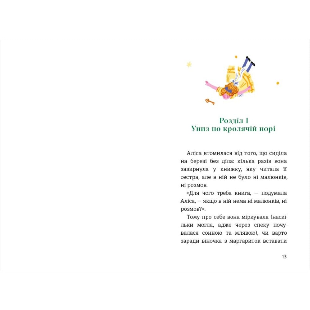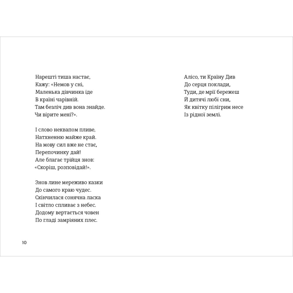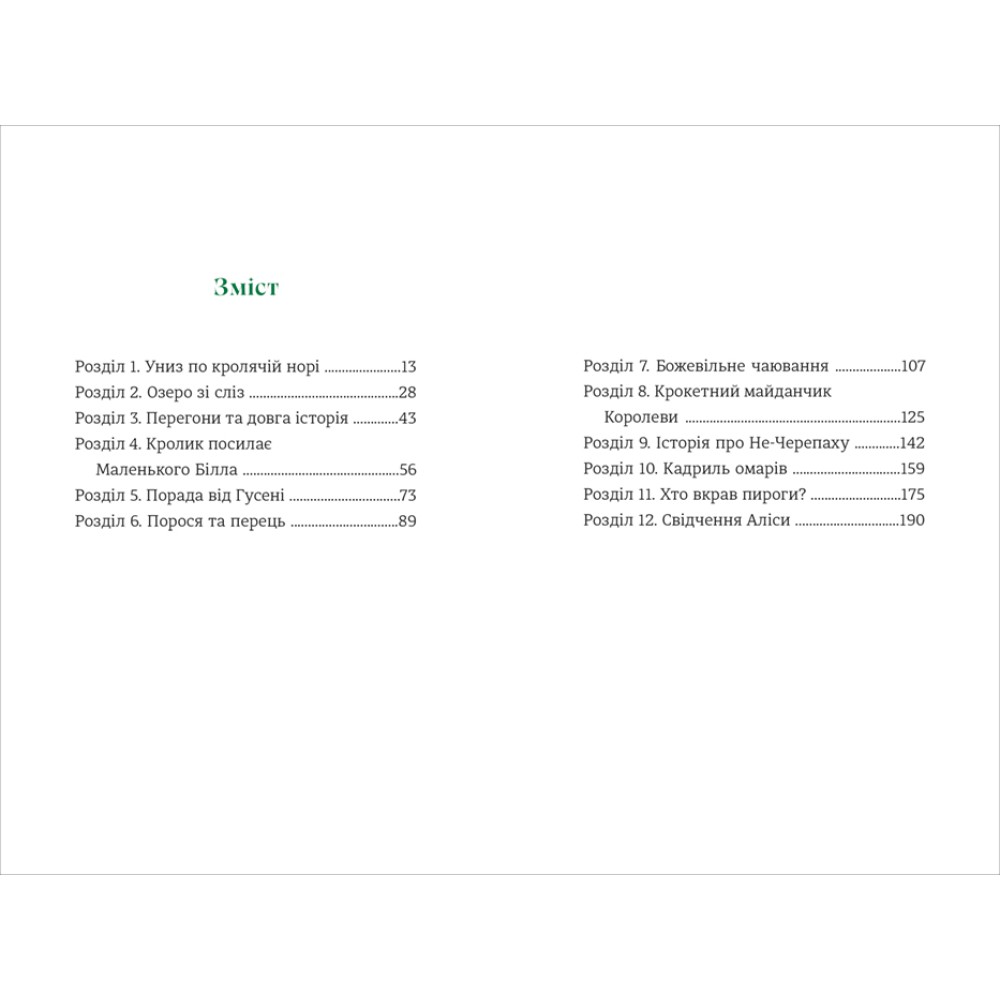 Дивовижна історія пригод маленької дівчинки Аліси у чарівній країні, де звірі розмовляють, карти ходять і грають у крокет, а кіт із легкістю розчиняється у повітрі. Чи можливо випити щось і вирости до небес або з’їсти шматочок пирога і зменшитись до розмірів мишки? Аліса зустрічає багатьох чудернацьких героїв, знайомиться із дивними звичаями світу чудес і мало не втрачає голову, аж раптом виявляє, що все це було лише її фантазіями уві сні. Пропонуємо і вам поринути у прекрасну казку, якою захоплюються діти і дорослі у всьому світі.