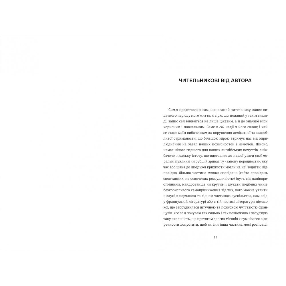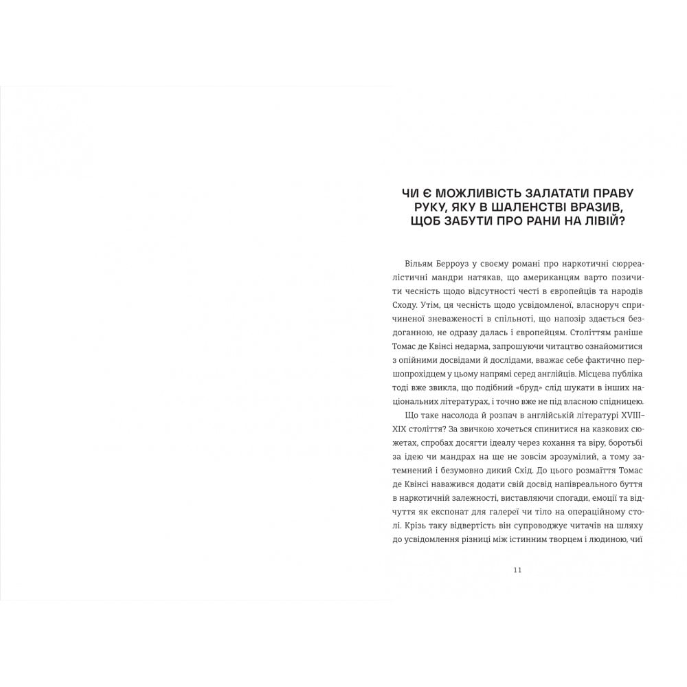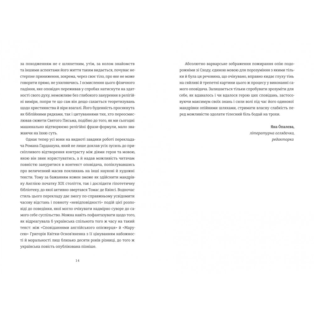 Автобіографічний текст Томаса де Квінсі вражає читачів уже не одне століття своєю відвертістю. «Сповідання англійського опієжерця» й «Suspiria de Profundis» — взірці опису задоволень і болів від вживання опійної тинктури, або ж лаудануму (натоді легального знеболювального засобу). Автор описує свої сюрреалістичні сни, марення, нічні жахіття, параною та проблеми зі здоров’ям, які виникли внаслідок споживання цієї речовини. Викладені спогади й самоаналіз пересипані цитуваннями класичних творів і біблійних рядків, визначних поем і віршів; також це видання доповнене примітками перекладача, які покращують розуміння цього дійсно філософського трактату.
