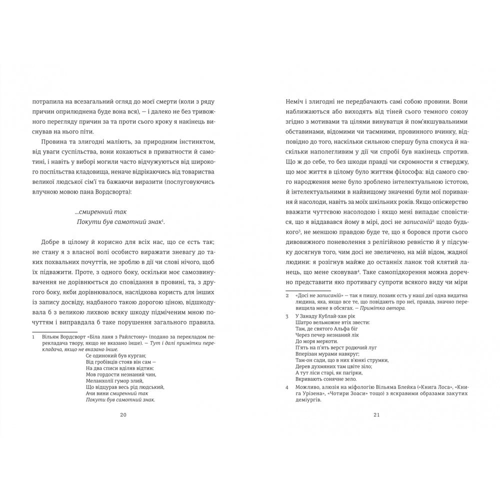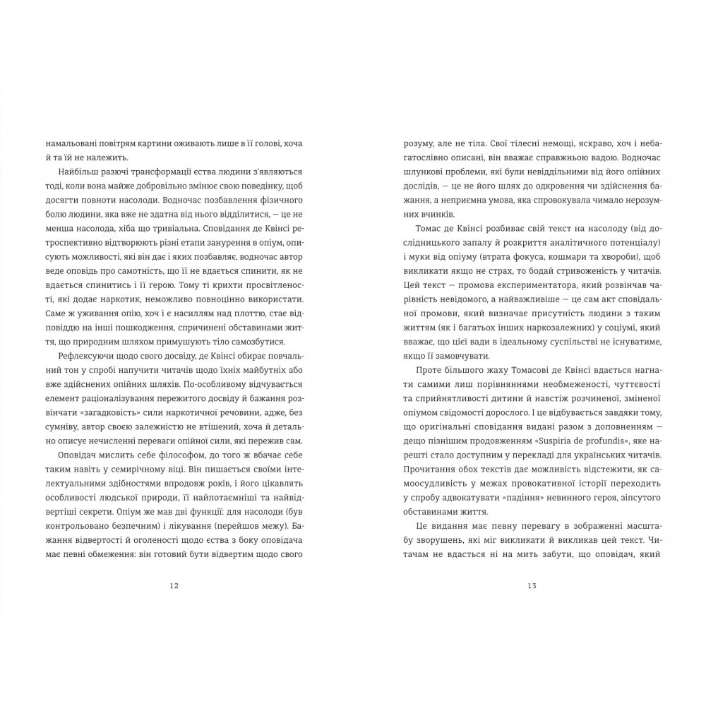 Уперше перед українськими чительниками предстане «Suspiria de Profundis», що є логічним продовженням «Сповідань», де Томас де Квінсі переходить до адвокатування «падіння», наголошуючи на обставинах, у яких опинився. Ці два тексти — промова експериментатора, який розкриває чительникам табуйовану тему наркотичної залежності.