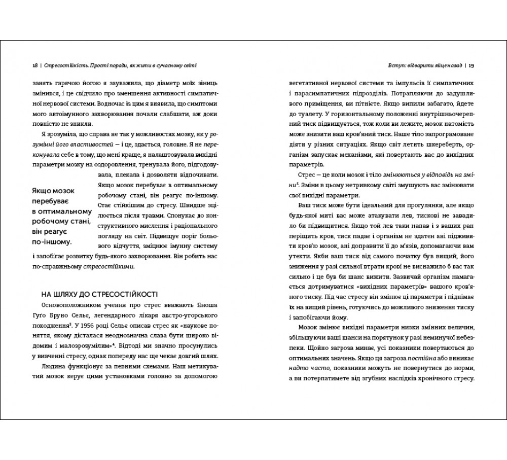 Надмір інформації з різних гаджетів, багатозадачність, дедлайни, існування в умовах пандемії та ізоляції – як впоратись з невгамовним стресом у цьому шаленому світі? Міту Стороні глибоко дослідила це питання і знайшла шлях до подолання стресу, пояснюючи його механізм на рівні нервової, гормональної, імунної системи. І її книжка – своєрідна інструкція як зберігати спокій і покращити своє життя. Це практичні поради, як протистояти стресу за допомогою зміни харчування, фізичної активності, сну, роботи над емоціями, медитації, сеансів масажу і навіть комп’ютерних ігор. Будь-який маленький крок наблизить до стресостійкості.
