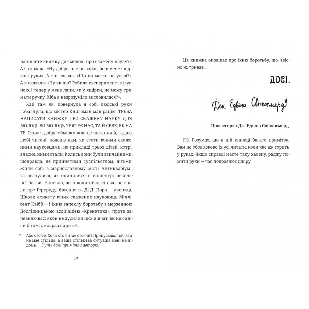 Ніхто на цілім світі, не те що в місті Антикваріум, не мріяв опинитися в руках у Міллісент Квібб — загрозливої, страхітливої, легендарної скаженої науковиці! Та й хто проміняв би захопливі уроки етикету на дивакуваті досліди й польоти на мухоциклі? Хіба що сестрички Порч — Ґертруда, Євгенія та Ді-Ді, яким судилося не просто пізнати скажену науку, а й порятувати рідне місто від зловісних змовників.